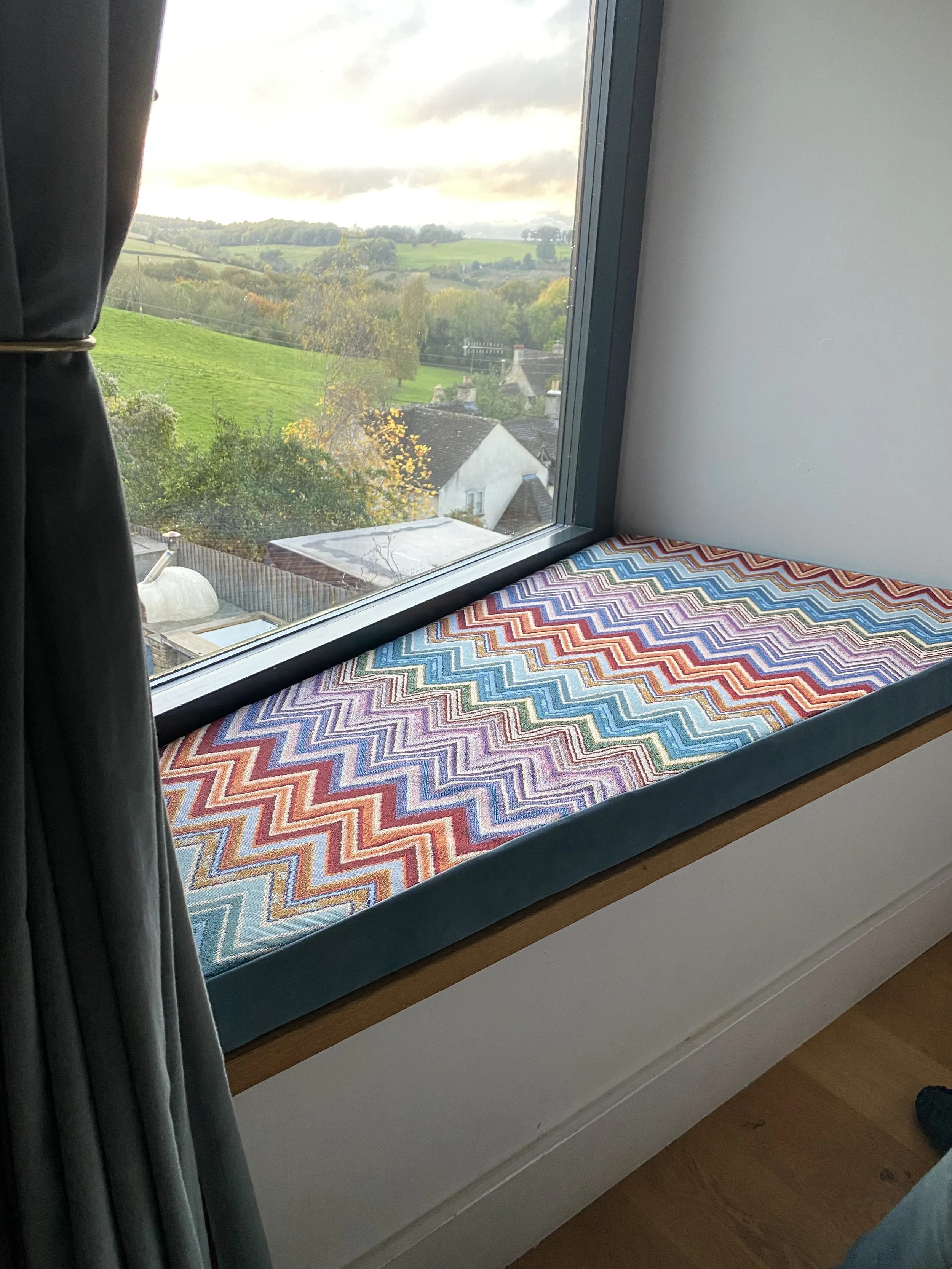 Missoni-esque end of line zig-zag fabric on a luxurious duck egg blue velvet from one of my happy places - Painswick fabrics.