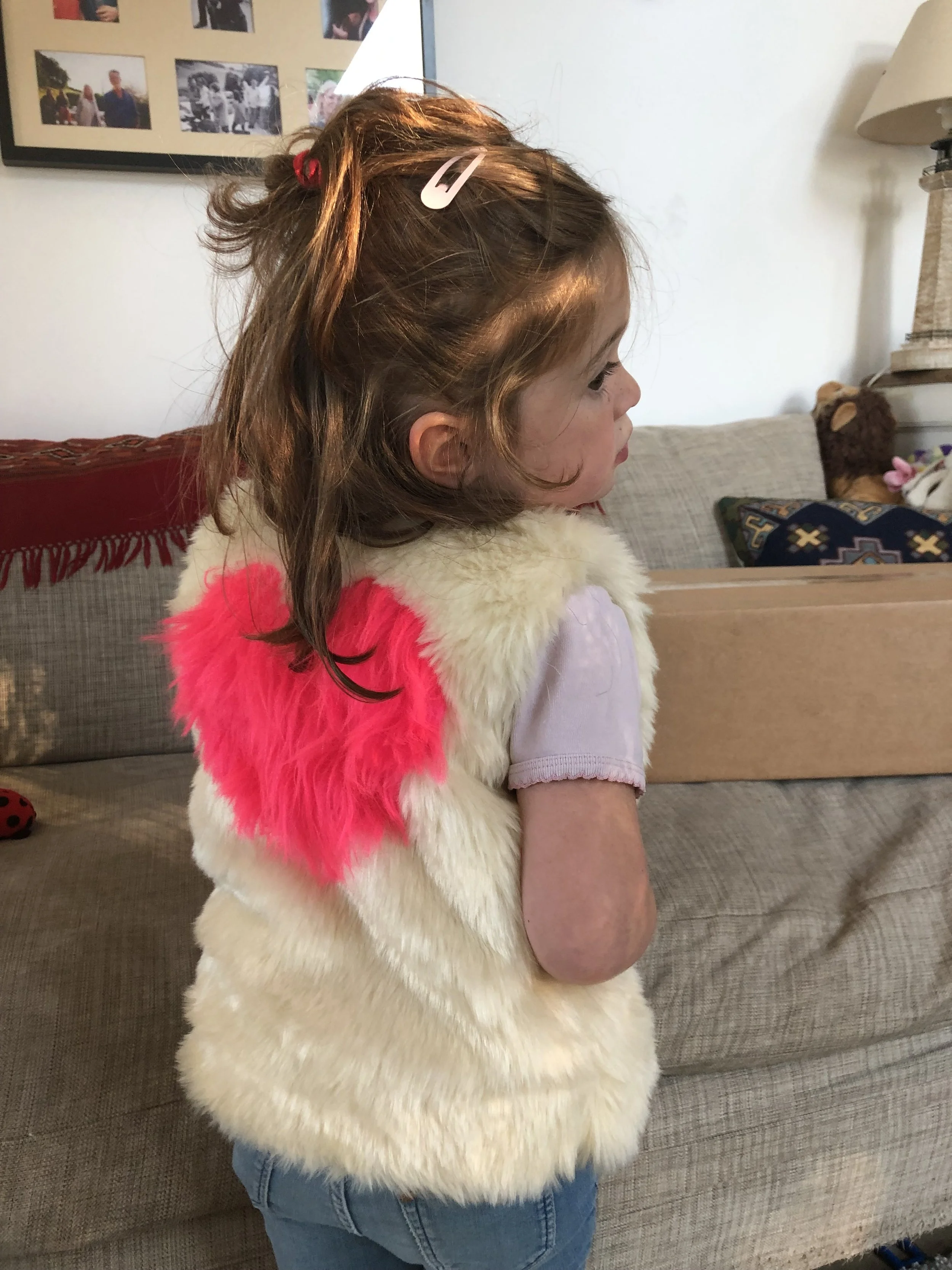 Super soft cream faux fur gilet, lined with unicorns and an extra long pile pink neon heart on the back.